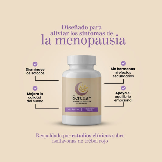 Serena+ es un suplemento 100% natural a base de extracto estandarizado de trébol rojo, una planta rica en isoflavonas que actúa como apoyo durante la menopausia.